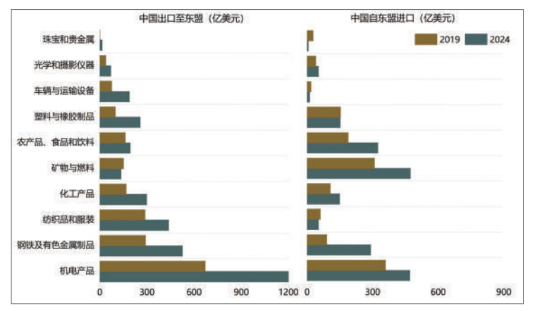 中国和东友邦家的财产互补劣势不竭深化。数据显示(图1),截至2024年,东盟对华钢铁及有色金属成品出口较2019年增加跨越两倍,农产物、食物饮料以及矿物燃料等资本型产物出口增幅均冲破50% 。同期,中国对东盟机电产物、化工品及纺织服拆三大类商品出口增速均超70%,塑料取橡胶成品及车辆运输设备出口增幅实现翻番。商业便当化办法显著加强两边财产互补劣势,产供链分工协做得以深化,抗风险能力进一步提高。