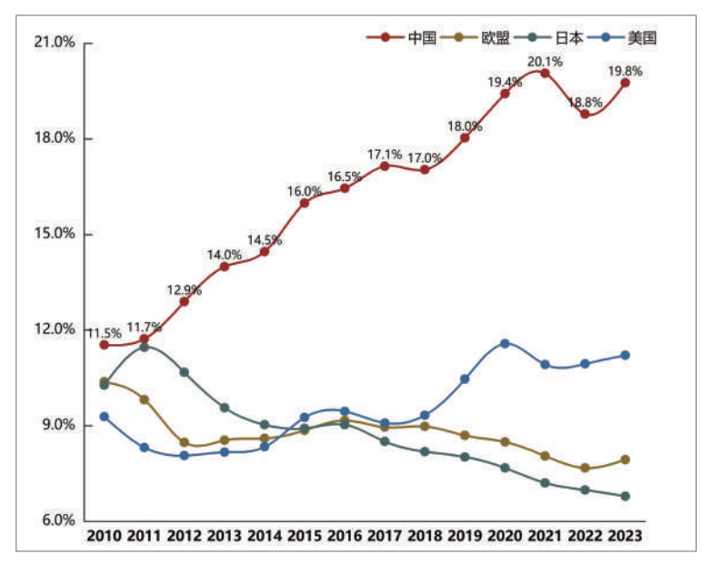 中国-东盟货色商业额占东盟外贸总额比沉已从2010年中国-东盟自贸区成立之初的11。5%上升至2023年接近20%的程度,高于东盟取其他次要商业伙伴的商业规模占比(图2)。